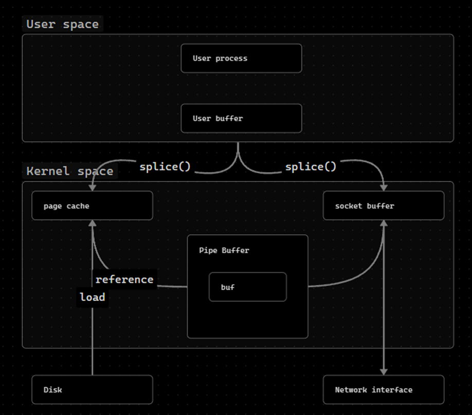 - splice() does this by not moving the actual data into the pipe, but rather the reference to this data in the pipe → now the pipe contains the reference to the location of the page cache in memory where the desired data is stored, and no longer the actual data itself.